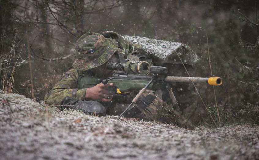 Kaupunkijääkärikomppanian tarkka-ampujan aseena on suomalainen 8,6 mm tarkkuuskivääri,