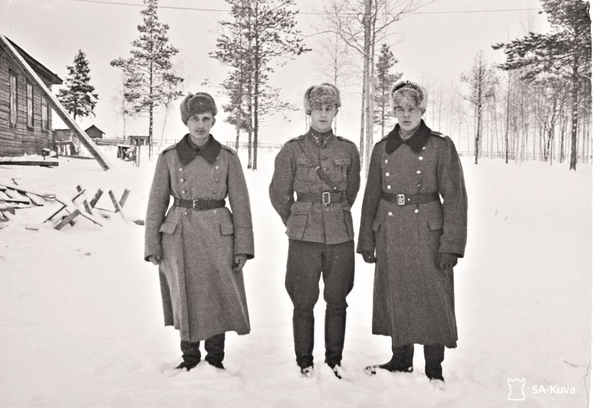 2./JP 2:n päällikkö kapteeni Tuomas Liponkoski ja komppanian Mannerheim-ristin ritarit Aarre Voutilainen (vasemmalla) ja Paavo Korpi (oikealla)