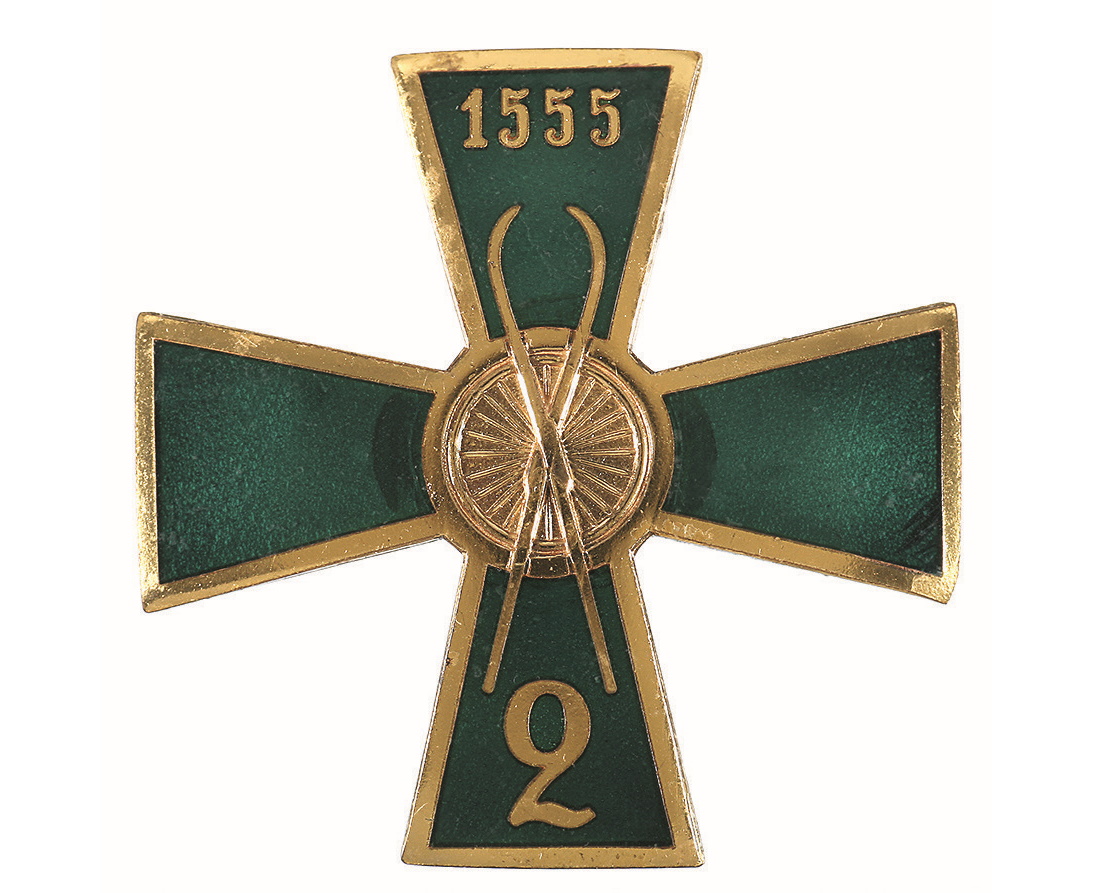 pyörä - suksi kuvio. Ristin alasiivessä on kullattuna numero 2 ja yläsiivessä kullattuna vuosiluku 1555”.