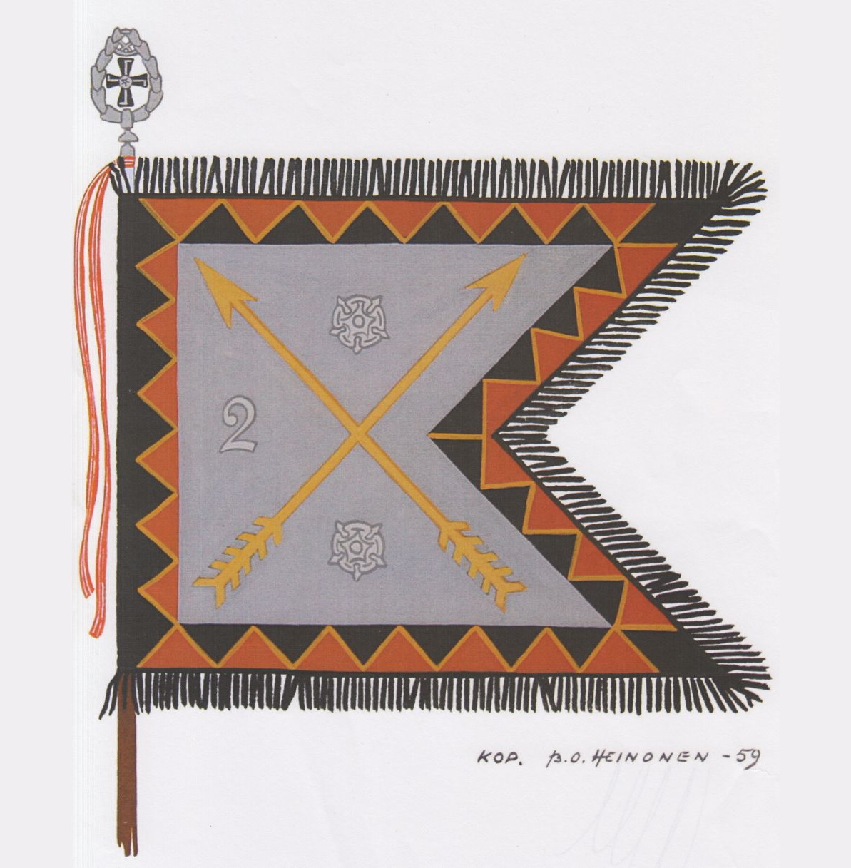Alun perin lipputangon kärkeä koristi keihäänkärjen muotoisen kehyksen keskelle