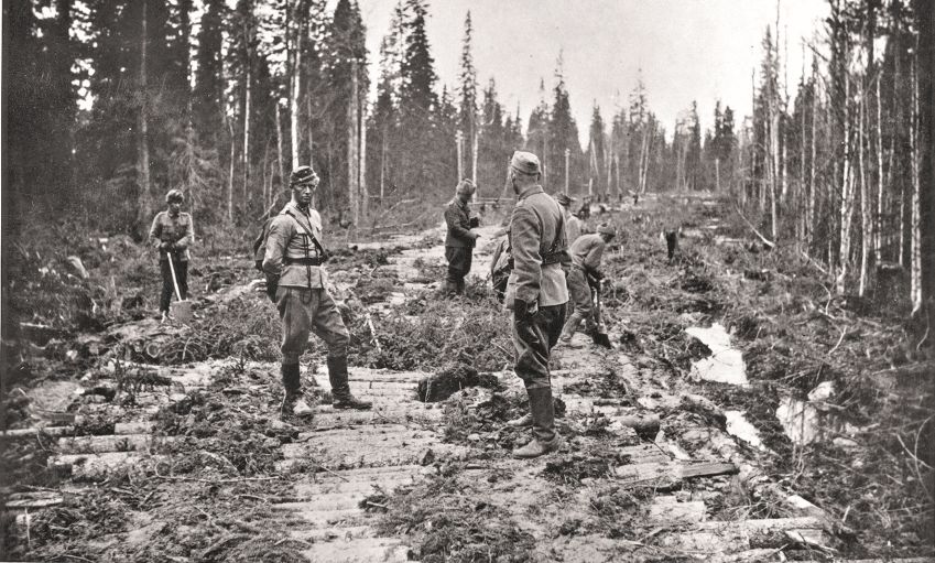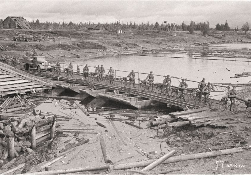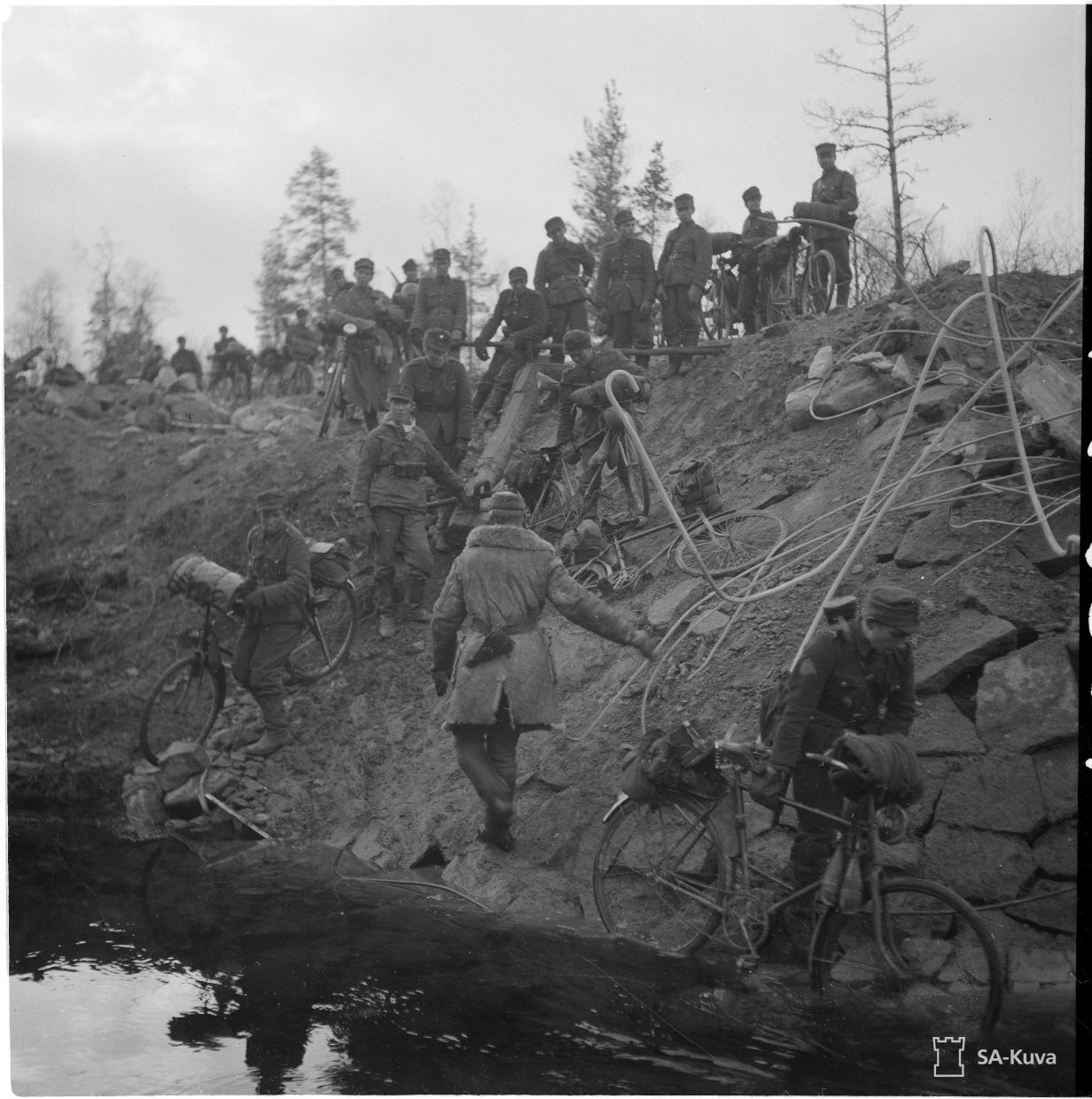 Jääkärit etenevät Jäämeren tiellä. Ensin on laitettava räjäytetyn sillan lähistölle väliaikainen silta,
