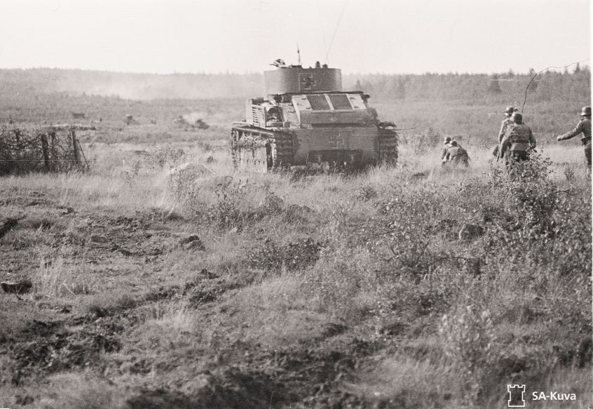 Jääkäreiden ja panssarivaunujen yhteistoimintaa harjoiteltiin Äänislinnan ympäristössä. SA-kuva.