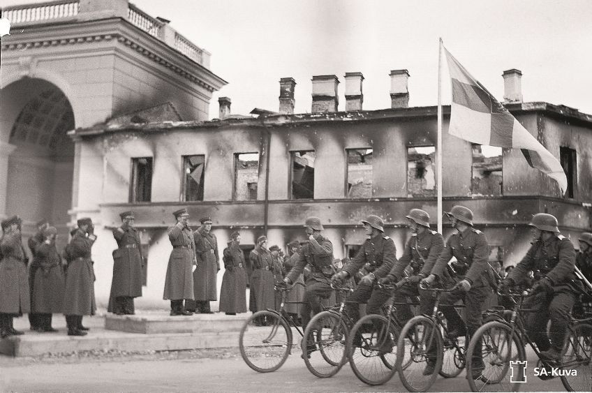 Jääkäripataljoona 2 Äänislinnan valtausparaatissa 2.10.1941. Oikeaan käteen haavoittunut